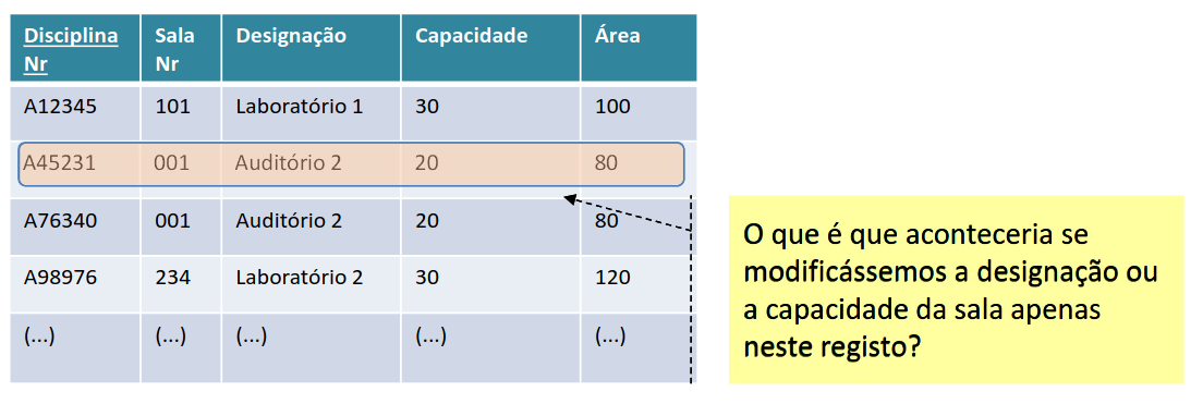- Uma anomalia de inserção ocorre quando não se é capaz de se inserir um dado registo numa tabela por causa da inexistência de outros dados. (EX: Tentar inserir um registo com um valor NULL num atributo que não aceita valores nulos)