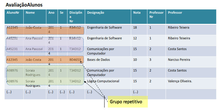- Uma tabela não está normalizada se contiver um ou mais grupos de dados repetidos e se se verificar a possibilidade de ocorrência de uma série de anomalias que podem conduzir a própria base de dados a um estado de inconsistência