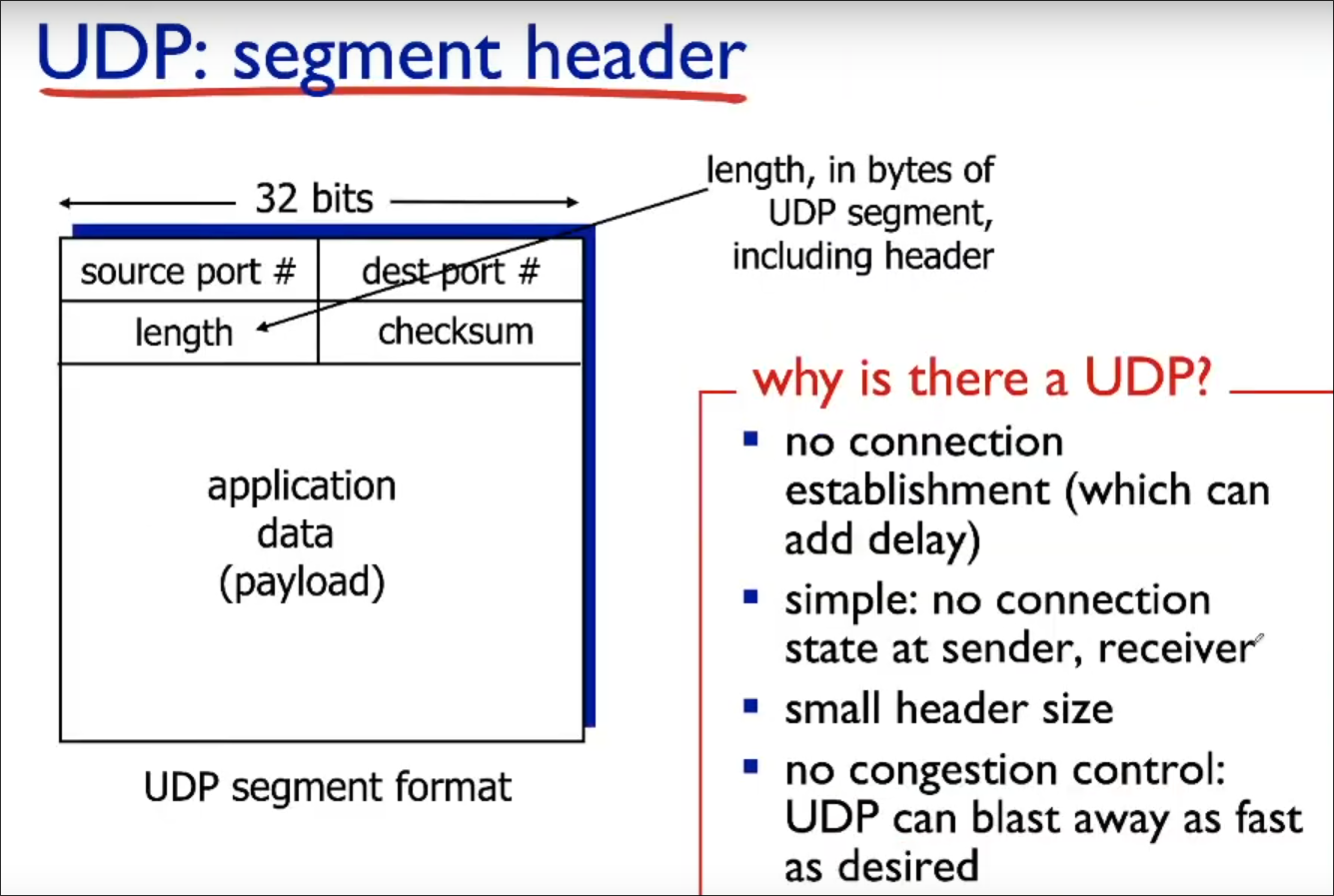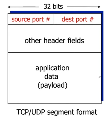 - demux: receiver uses all four values to direct segment to appropriate socket