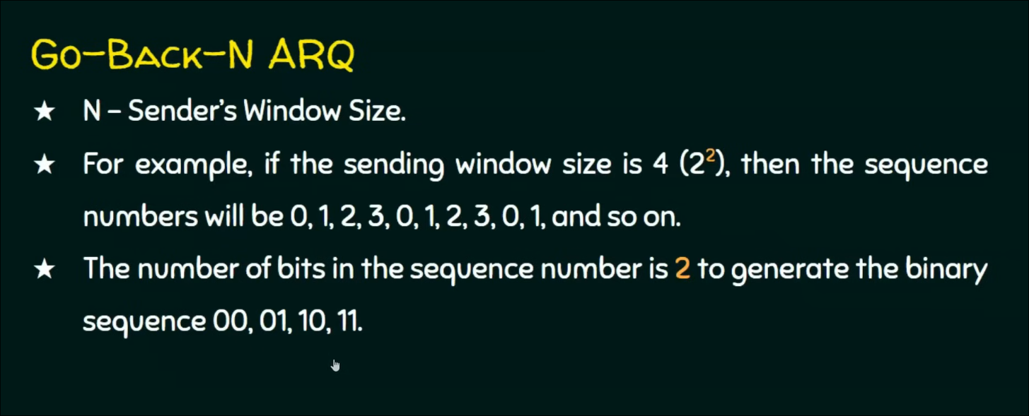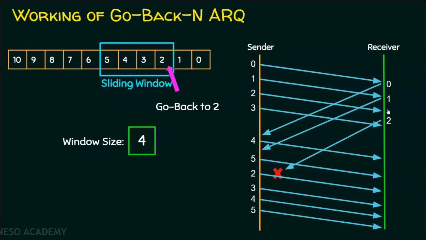 - If the ack of a frame does not arrive before timeout, all frames in current window are retransmitted