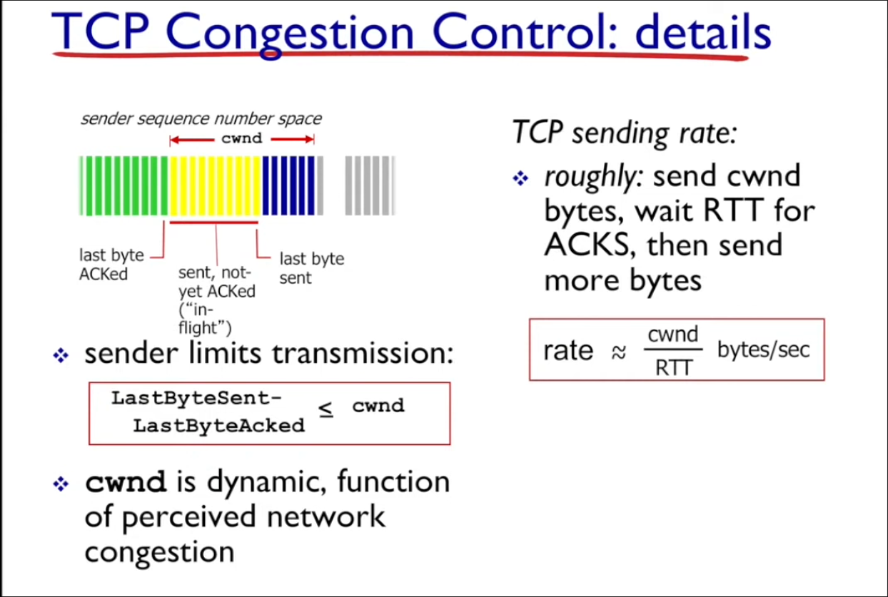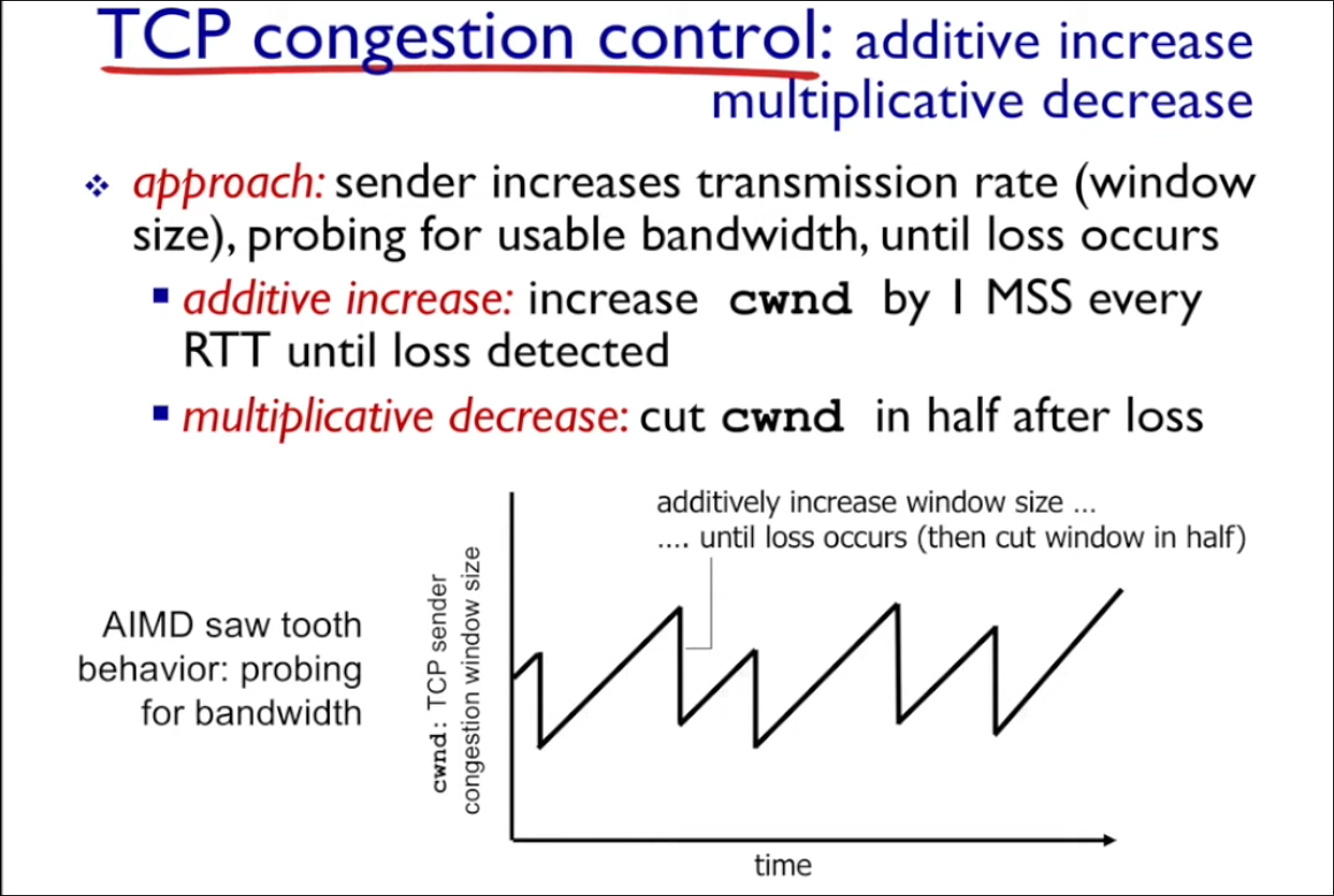 - AIMD (Additive Increase/Multiplicative Decrease)