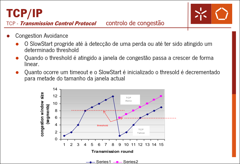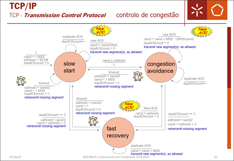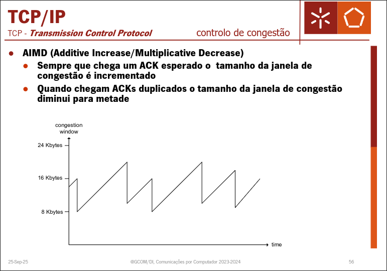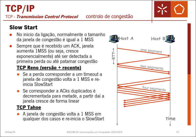 Janela de Congestão (CongWin): LastByteSent – LastByteAcked <= MIN ( RecvWin,CongWin)