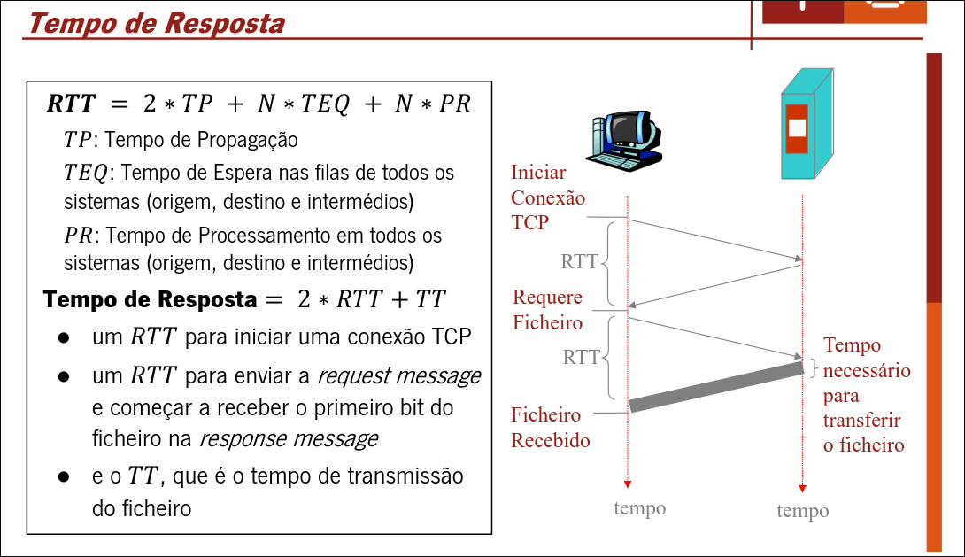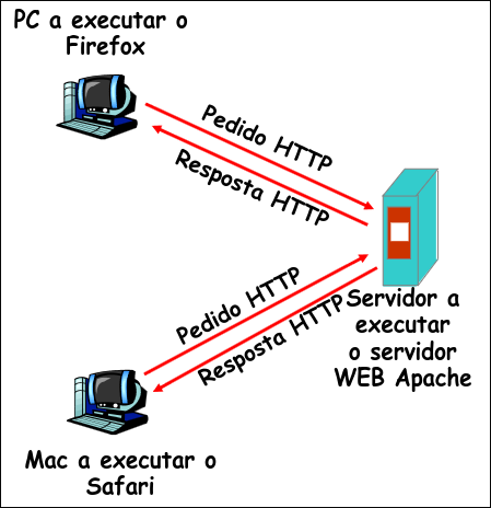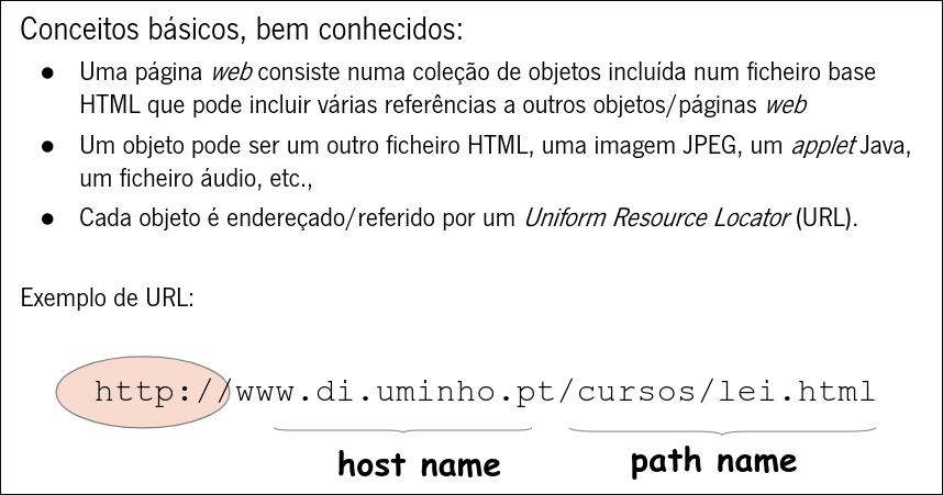 - Modelo cliente/servidor -> cliente: browser pede, recebe e mostra objetos Web -> servidor: servidor envia objetos como resposta a pedidos