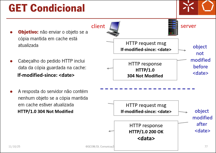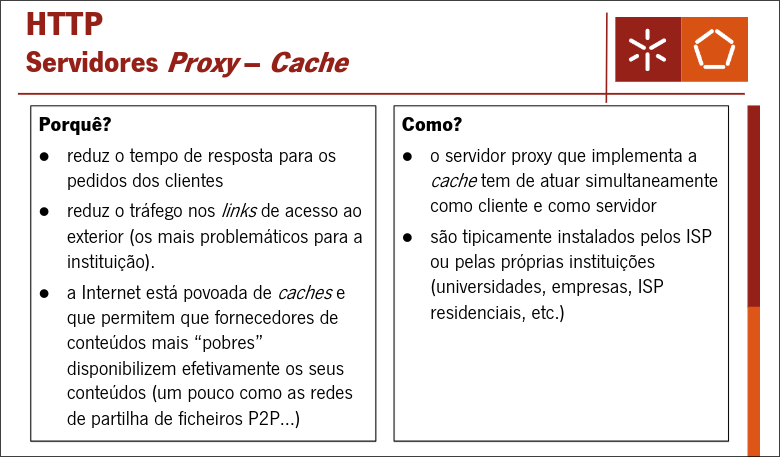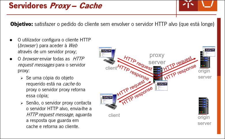 - Broswer comunica com servidor proxy, que se tiver em caches a resposta envia HTTP response ao brower, senão o proxy contacta o servidor HTTP alvo.