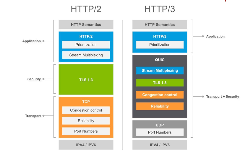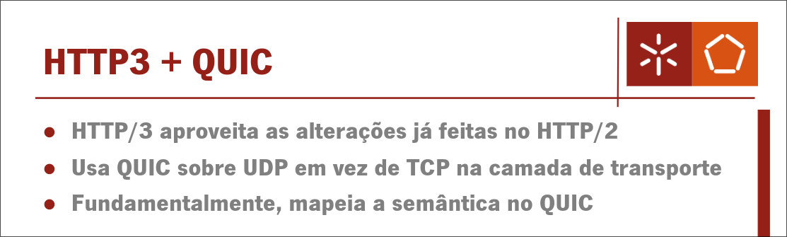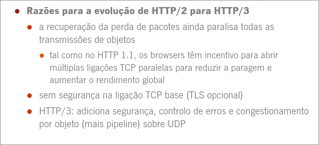 QUIC - Orientado à conexão, garante entrega ordenada dentro de uma stream (não entre streams), recuperação de erros com retransmissão, com cigrafem, usa de Stream ID para multiplexagem de streams