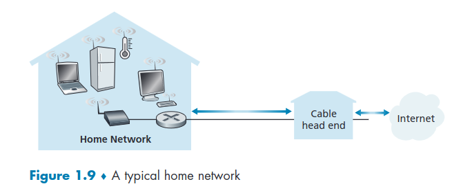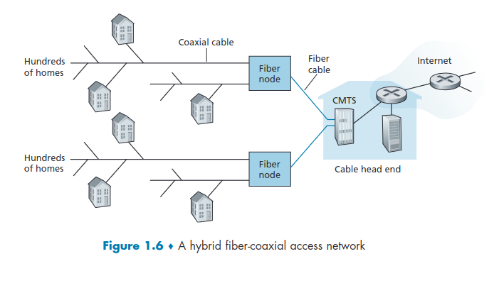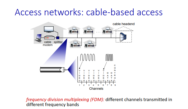 - network of cable and fiber attaches homes to ISP router -> home share access to router (shared broadcast medium) (share different houses traffic; the traffic compete for cables bandwidth) -> unlike DSL, which has dedicated access (data specific to each house)