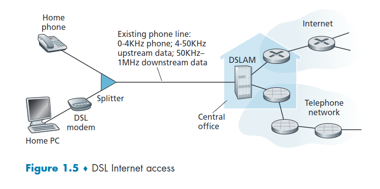 - Uses existing telephone infrastructures to central DSLAM -> data over DSL phone line goes to Internet -> voice over DSL phone line goes to telephone net