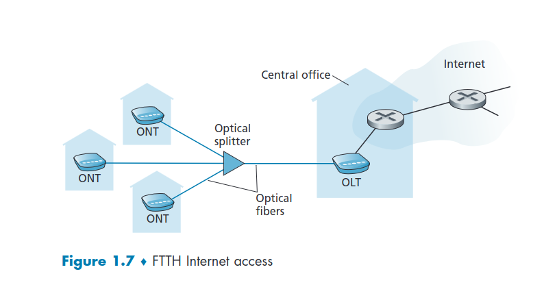 FTTH (fiber to the home) -> provides an optical fiber path from the Central Office to the home, can potentially provide internet access rates in the gigabits per second range. Can be asymmetric or symmetric depending on the ISP subscription.