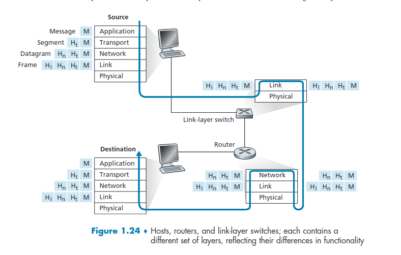 H stands for header: -> M -> message (packet at the application lever) -> Ht -> tansport header (Ht + M = segment (packet at the transport layer)) ->Hn -> network header (Hn + Ht + M = datagram (packet at the network layer)) -> Hl -> link header (Hl + Hn + Ht + M = frame (packet at the link layer))