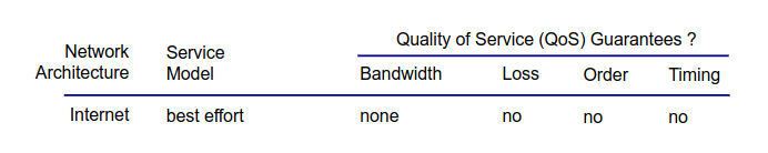 - The Internet’s network layer provides a single service, known as best-effort service -> has none of the guarantees above. Like a no service service.