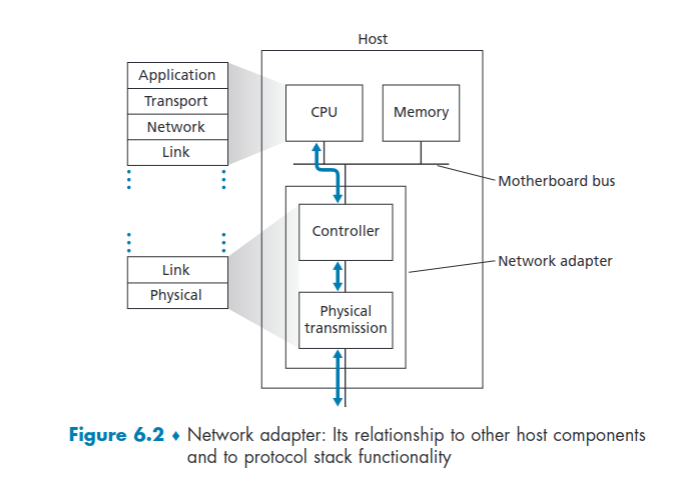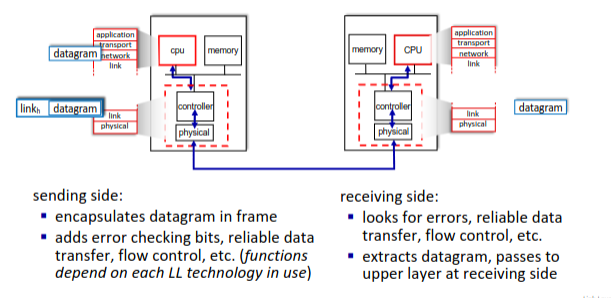 - The link layer is implemented on every host as well as the physical layer in a chip or a Network Interface Card(NIC) (EX: Ethernet chip set)