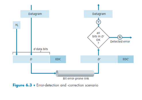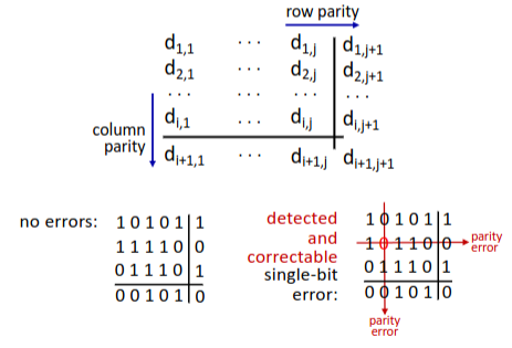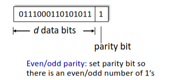 -> Single Bit Parity: detects single bit errors - compute parity of d received bits - compares with received partity bit - if different than erros detected