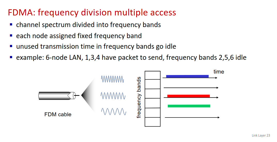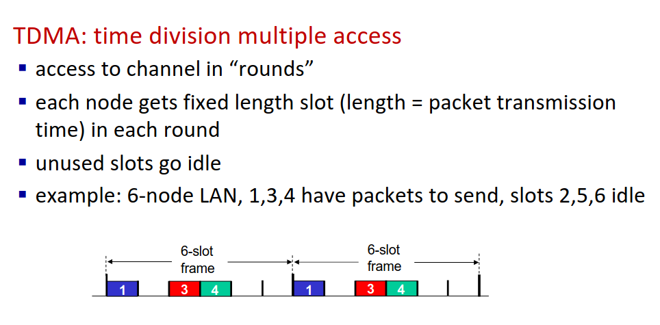 MAC protocols: taxomony -> channel partitioning - devides channel into smaller exclusive use pieces -> random access - channel not divided, causing collisions to be solved -> taking turns - take turns, but nodes with more to send can take longer turns