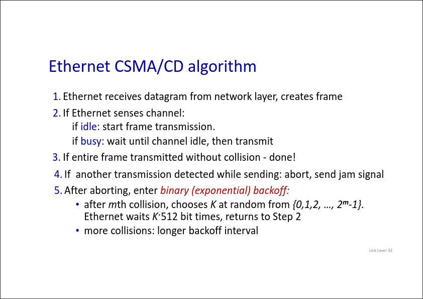 - collision detection easy in wired, difficult with wireless -> human analogy: the polite conversationalist → better performance than ALOHA and cheaper and simples to implement