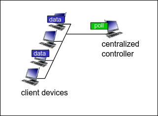 - taking turns -> polling from central site, token passing -> Bluetooth, FDDI, token ring